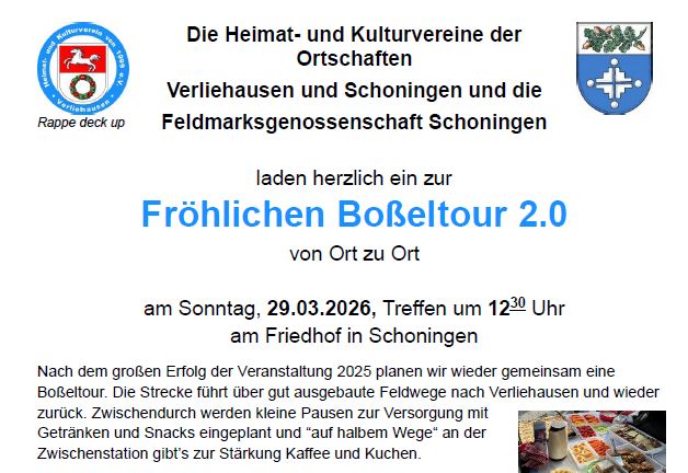 Nach dem großen Erfolg der Veranstaltung 2025 planen wir wieder gemeinsam eine Boßeltour mit dem HKV und Feldmarksgenossenschaft Schoningen. Näheres hier im Flyer Einladung Boßeltour2.0 2026